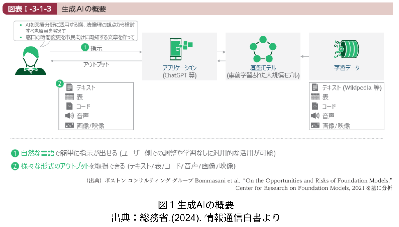 一般的に生成AIとは、「既存のデータから学習し、新しいコンテンツを作成するために使用される人工知能の一種」(IBM, 2024)と見なされている。