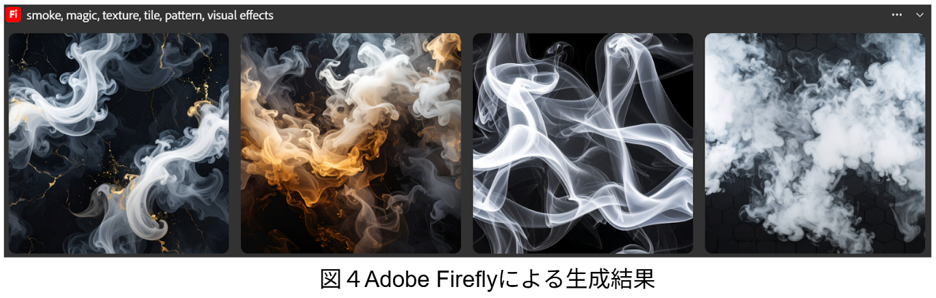 Adobe Fireflyを使用することで検証結果に差が生じることを懸念し、先行事例に使用されていたプロンプト「smoke, magic, texture, tile, pattern, visual effects」を使用して結果を確認したが、問題なく類似した結果が出たため、上記ワークフローを採用。