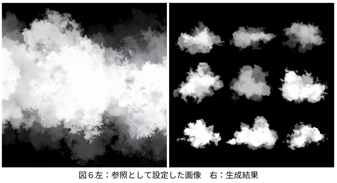 stylized hand-drawn dense fog loop, painterly texture, game asset, isolated on black何度か生成した素材の中から理想に近い画像を選択し、参照へ設定した。これにより、より理想に近い素材を作成することができた。